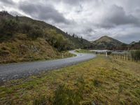 This stock photo features a stunning mountain landscape with a curving road winding through the highland. The scenery is filled with lush vegetation, including trees, grass, and other plant life. The road surface is made of smooth asphalt, perfect for driving. A river can be seen flowing alongside the road, adding to the picturesque view. The sky is slightly gloomy, with grey clouds overhead. This image captures the beauty of rural scenery, perfect for illustrating concepts like adventure, travel, and exploration.