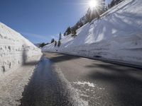 This stunning stock photo captures a beautiful winter landscape in California. The photo features a snowy mountain pass surrounded by majestic mountain ranges and towering trees. The clear sky allows the warm sunlight to illuminate the scene, creating a picturesque view. The well-maintained asphalt road stretches straight ahead, inviting travelers to explore the mesmerizing scenery. Experience the breathtaking beauty of Mammoth Lake as you journey through this freezing but awe-inspiring mountain pass.