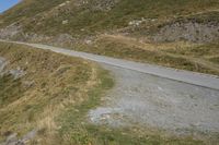 A breathtaking view of a scenic mountain road in Italy. The road surface is made of dirt and gravel, with a curve bending through the rugged terrain. On one side, there is a steep mountain covered with plants and a grassy area on the far side. The landscape is picturesque, surrounded by the beauty of the highland. This road is a perfect entryway to explore the natural beauty of Europe, particularly in Italy.