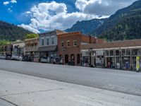 Scenic mountain road in Ouray, Colorado. Suburban village lined with storefronts and restaurants. Clear skies and clouds provide a picturesque backdrop. Perfect spot for a day of shopping and eating out.