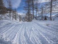 A scenic mountain road in the Swiss Alps at dawn. The snow-covered landscape is bathed in soft sunlight, creating a picturesque winter scene. The off-road track winds through the wilderness, offering a path to explore the stunning natural beauty of Europe's mountain range.