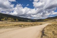 A scenic mountain road winding through the wilderness. The dirt and gravel path curves and twists, surrounded by lush green grass and tall trees. The cloudy sky adds to the picturesque landscape.