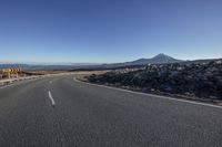 A picturesque landscape with a winding road surrounded by lush vegetation and towering mountains. The asphalt road surface curves through the rural scenery, protected by Armco barriers and guard rails. An idyllic day for a scenic drive.