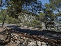Enjoy a sunny day in Mallorca, Spain, as you ride your bike along the beautiful asphalt road surrounded by breathtaking natural landscapes. Feel the refreshing breeze as you pass by the lush forest and admire the stunning cliff-side views. The clear sky above adds an extra touch of serenity to the scenery. Don't forget to stay safe with the Armco barrier providing protection along the road. Explore the wonders of this charming island in Europe, located in the Balearic Islands.
