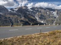 a motorcycle rides down the road by the mountains near the end of the highway with snow capped peaks in the distance