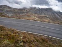 a person rides their bicycle along a winding road through mountains under cloudy skies and fluffy clouds