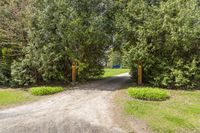 an entrance way through the woods to a home in a wooded area in oregon, where there is an open sign with a blue dot