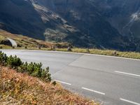 A picturesque landscape in Austria, showcasing a winding asphalt road surrounded by lush green grass, tall mountains, and vibrant vegetation. With the clear blue sky above and sunlight illuminating the road surface, this captivating view is perfect for representing the beauty of Europe's highlands and nature's scenic wonders.
