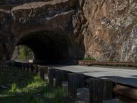 A scenic road in Colorado, USA. The clear sky casts hard shadows on the asphalt, creating an intriguing landscape. The road passes through tunnels and underpasses, with mountains and bridges in the background. A perfect day to explore nature.