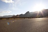 a motorcycle is traveling along the side of the road with mountains in the background under a blue sky with sun glare