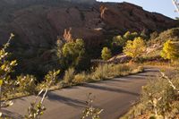 Aerial view of a scenic road winding through the red rock formations of Colorado. The road is paved with asphalt and marked with road markings. The medium format photograph captures the beauty of the landscape, with grassy plains, majestic mountains, and tall trees. The sunlight filters through the clouds, creating a lens flare effect. The viewer can see the road as it stretches into the distance, leading towards the mountain range in the background. It is a bright sunny day, perfect for transportation and nature enthusiasts to explore this picturesque area in the USA.
