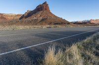 This captivating stock photo features a scenic road at dawn in Utah, USA. The road, made of smooth asphalt, winds its way through the breathtaking desert landscape characterized by towering red rock mountains and rocky terrain. The image showcases the natural beauty of the area, with clear skies and the untouched wilderness forming the backdrop. The road's infrastructure seamlessly blends into the geology of the land, leading through the captivating badlands of the Canyonlands National Park. The Needles, a distinctive mountain landform, can be seen in the distance, creating a stunning vista. Perfect for illustrating concepts related to nature, landscapes, and the beauty of the great outdoors.