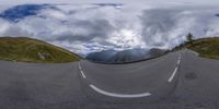 A scenic road in the highlands of Austria. The winding asphalt road cuts through the mountain landscape, with lush grass and vegetation on either side. The clouds create a dramatic backdrop against the clear blue sky.