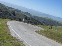 A scenic road in the highlands of California, USA. The asphalt curves along the mountain pass, offering breathtaking views of the rural landscape. Clear skies illuminate the elevated slopes and fallen cliffs.