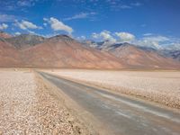 This breathtaking stock photo captures a scenic road through the California desert. The asphalt road winds through the desert landscape surrounded by majestic mountains and vast plains. The day is sunny with a few clouds dotting the sky. The rugged brown terrain and tints and shades of the desert create a stunning contrast against the clear blue sky. This off-road track offers the perfect opportunity for adventure lovers to explore nature's beauty in this highland region. The road surface is a mix of gravel and dirt, adding to the rustic charm of this picturesque location. Experience the thrill and tranquility of the California desert with this stunning image.