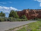 A scenic road in Kodachrome Basin State Park, Utah, surrounded by lush greenery and towering mountains. The straight road stretches into the distance, inviting travelers to explore the rural beauty. A peaceful dawn in the heart of nature.