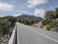 This stock photo features a picturesque road in Mallorca, Balearic Islands, Spain. The asphalt road winds through the stunning mountain landscape, surrounded by lush green trees and rugged rock formations. It is a beautiful day with clear blue skies and fluffy white clouds. The road surface is well-maintained, with lanes and an Armco barrier for safety. This scenic road is a popular route for nature lovers and adventure seekers, offering a breathtaking view of the highlands and wilderness of Mallorca. Explore the beauty of Europe in this captivating image.