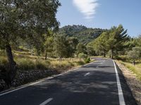 A scenic perspective of Mallorca's rural landscape. An empty road winds up past the mountains and trees, creating a picturesque view. Clear skies and nature add to the beauty of this European road trip.