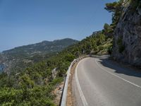 A scenic road in Mallorca, Spain, winding through the beautiful landscape. Clear skies and a sunny day make it a perfect drive. Armco barriers protect drivers along the way.