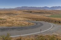 A breathtaking landscape in New Zealand's South Island. This stunning photo captures a road leading through dry grass hills with majestic mountain peaks in the background. The clear blue sky enhances the beauty of this natural environment. The road, made of smooth asphalt, curves gracefully through the highlands, offering an elevated view of the surrounding highland and mountain landforms. A pristine lake glistens in the distance, reflecting the serene surroundings. This image showcases the beauty of the New Zealand countryside, combining nature, infrastructure, and the allure of the great outdoors.