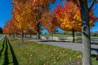 This captivating stock photo captures a picturesque scene in rural Ontario, Canada. The image showcases a winding road surrounded by a grassy field, vibrant fall trees, and leaves scattered on the ground. The clear blue sky provides a beautiful backdrop, adding to the overall charm of this Canadian countryside. The lush greenery and agricultural landscape highlight the natural beauty of this area, making it a perfect representation of the serene and tranquil countryside of Ontario.