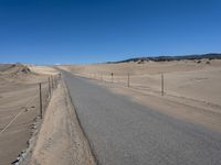 A picturesque road winds through the sand dunes on a sunny day in California, USA. With majestic mountains in the distance and a fenced off roadway, this coastal landscape showcases the beauty of nature and the tranquility of the ocean. The road surface, made of asphalt, gracefully cuts through the sandy desert and leads towards the horizon. The sand dunes, shaped by the Aeolian Landforms and influenced by geology, create a stunning natural environment. This deserted thoroughfare offers an ideal escape into the clear sky and serenity of the California coast.