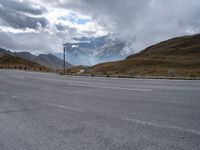 the open road on the mountain with snow capped mountains in the background near an empty highway