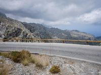 This stock photo captures a scenic road in Spain with a stunning view of mountains. The image shows a sign on the side of the road warning motorists to stay at this point. The road is surrounded by beautiful landscape, nature, trees, and vegetation. There is a mountain range in the background covered with snow. A loch, river, and reservoir are also visible, adding to the overall picturesque scene. The image was taken during the day, showcasing the clear blue sky and clouds. It represents the winter season in the highlands of Spain, providing an amazing overview of the infrastructure and Armco barrier. The location is in the Balearic Islands, Europe.
