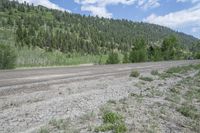 the empty road is near a pine covered mountain side slope - top land in the background