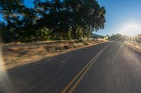 A scenic road trip through rural farmland. Sun rays shine through the car window, illuminating the asphalt road surface and surrounding vegetation. Clear skies and sunny weather create a picturesque landscape.