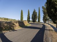 This stock photo shows a scenic road in Tuscany, Italy. The road is made of asphalt, surrounded by lush grass and woody plants. It is a sunny day with a clear sky, casting shadows on the road surface. The landscape is rugged and rural, with trees and cypress gardens lining the thoroughfare. The image captures the beauty of nature in Tuscany, one of the picturesque regions in Europe. The photo is perfect for illustrating infrastructure, road trips, or the charm of Italian countryside.