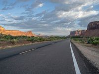 A scenic view of an asphalt road winding through the breathtaking landscape of Utah. The road leads into a canyon, with beautiful clouds and nature surrounding it. The dawn sky adds a touch of magic to the landscape.