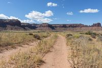 A scenic road in Utah, surrounded by low sand dunes and red rocks. The dirt track leads through a rugged landscape with views of majestic mountains. Clear skies and fluffy clouds complete the serene picture in Canyonlands National Park.