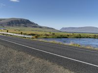 This stunning stock photo captures a scenic road with lush grass and bodies of water on both sides. The asphalt road winds through a breathtaking landscape with majestic mountains in the distance. The clear sky above creates a picturesque backdrop, perfectly highlighting the beauty of this highland location in Europe. The road surface, bridge, and Armco barrier provide safe passage for travelers exploring this incredible natural environment. The abundant vegetation and pristine water resources make this land lot a true paradise for nature lovers. Capture the essence of Iceland's breathtaking beauty with this captivating image.