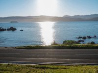 Scenic Roadway Leading to Water with Beach and Hills in the Background