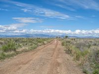 A scenic rural landscape in Colorado, USA. The dirt road winds through the picturesque countryside, surrounded by beautiful nature. Clouds fill the sky on this sunny day in the one-quarter area.