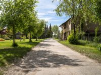 an old road runs through a small village with buildings and trees in the background, while some shrubs are growing