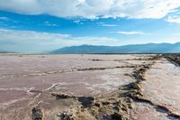 A scenic view of the Salt Lake in California, USA. The open space offers a clear day with clouds floating above. The salt surface reflects the majestic mountains in the background.