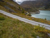 This stock photo features a breathtaking view of a winding trail surrounded by lush green grass and vegetation. In the background, a beautiful lake shimmers under the gloomy grey sky. The rugged terrain and mountain landforms add a sense of adventure and exploration to the scene. With its off-road track and gravel surface, this trail is perfect for nature enthusiasts seeking a highland adventure. The image captures the serene beauty of Austria, a picturesque country in Europe known for its stunning landscapes and water resources.