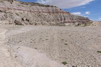 A rugged dirt road winds through the scenic landscape of Utah's desert. Red rock formations and cliffs create a striking backdrop against the clear blue sky. Explore the open spaces and off-road tracks of this stunning natural environment.