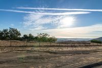 A picturesque view of mountains in the distance, with a dirt road leading to a pasture surrounded by an empty field of grass. The open plain is bathed in sunlight, creating a beautiful landscape. The sky is clear with a few clouds adding to the overall tranquility of the scene. This nature photograph captures the beauty of a sunny day, with the sun visible and its warm sunshine illuminating the grassy surface of the field.