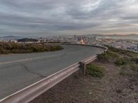 This stock photo captures the serene beauty of San Francisco at dawn. The image features an empty street at dusk, with the sun peeking out behind the hills. From a hilltop bench, the view offers a panoramic perspective of the city, showcasing its high-rise residential and rural areas. The tranquil scene includes a curved highway with asphalt roads and water resources surrounding the city. The elevated Armco barrier and guard rail ensure safety, while the grey sky adds a touch of serenity to the overall view.