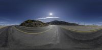 A scenic winding road cuts through the highlands, offering an elevated view of the surrounding landscape. The sunny sky contrasts with the gloomy grey mountains. A perfect recreation spot for nature enthusiasts.