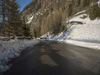 A scenic winter landscape in the Alps of Switzerland. A winding road cuts through the snow-covered mountains and leads to a mountain pass. The wet and freezing conditions are accentuated by the ice-covered trees and the Armco barrier lining the road.