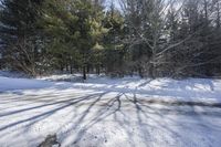 A scenic winter landscape in Ontario, Canada. Snow-covered road surrounded by tall trees and a clear sky. The forest provides a peaceful backdrop to the winding road. A perfect day to explore nature in Toronto.