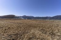 This breathtaking stock photo showcases a serene winter landscape in the highlands of Shangri-La, Yunnan. The field, surrounded by a fence and mountains, is covered in brown grass, adding a touch of rustic charm. The clear sky overhead emphasizes the natural beauty of this open space. With snow covering the ground, it's a peaceful scene that truly captures the essence of nature in this picturesque region of China.