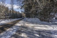 This stunning stock photo depicts a snow-covered country road in Ontario, Canada. The road is surrounded by a dense forest with tall trees and bushes, creating a beautiful natural landscape. The asphalt road surface is clear and leads into the distance, inviting you to explore. The sun is shining brightly, casting long shadows on the ground. The winter scenery is enhanced by the presence of snow on both the road and the surrounding vegetation. The image captures the peaceful and serene atmosphere of the area, making it a perfect addition to any nature or travel-related project. This photo is particularly suitable for projects related to Ontario, Canada, or winter landscapes.