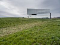 This image captures the rural landscape of Germany, specifically in Berlin. The scenic view showcases vast fields and green grass surfaces that stretch for miles. In the distance, a mirrored sculpture adds an artistic touch to the serene surroundings. The clear blue sky and fluffy clouds overhead create a picturesque backdrop. This photo represents the beauty of nature and agriculture in rural Europe, particularly in Germany. The well-defined path leads the viewer's gaze through the landscape, inviting them to explore the peaceful and harmonious setting.