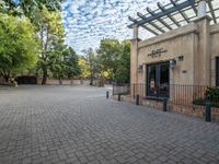 the entrance to an apartment building with brick pavers and an open patio area for entertaining people