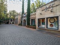 An urban scene in Sedona, Arizona showcasing historic architecture. The blue door at the entrance of the building stands out amidst the surrounding trees. A perfect spot for shopping in the USA.